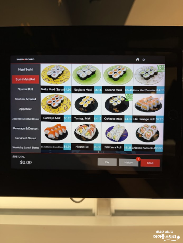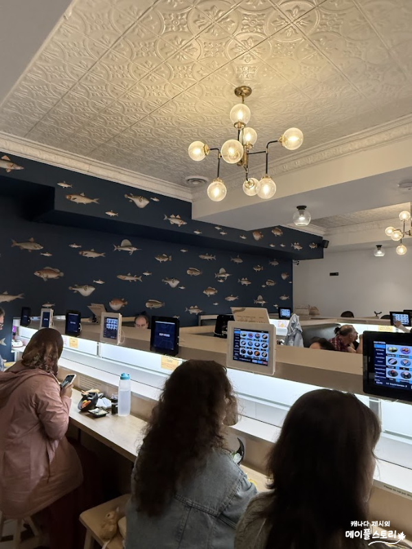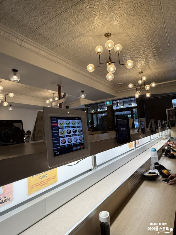 각 테이블마다 태블릿이 설치되어 있어, 스크린 터치만으로 쉽게 주문할 수 있어요. 직원이 직접 오지 않아도 되고, 주문 즉시 주방에서 조리해 기차에 태워 보내주니 편리함도 최고! 혼자서 조용히 먹고 싶은 날, 혹은 데이트처럼 방해받고 싶지 않은 시간에 딱 어울리는 시스템이에요. 참고로 캐나다에선 테이블마다 태블릿으로 주문할 수 있는 시스템이 아직 흔치 않아요.