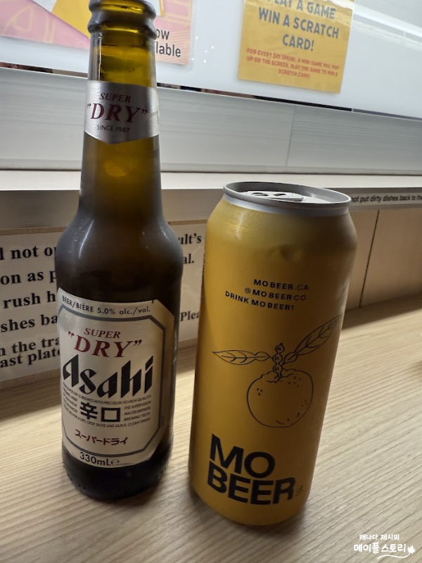 음식을 주문하면 제일 먼저 도착하는 건 바로 맥주! 초밥은 조리되어서 기차를 타고 오느라 시간이 조금 걸리지만, 시원한 맥주는 먼저 달려와줘요. 아사히(Asahi)는 깔끔하고 드라이한 맛이 특징이라 초밥이랑 정말 잘 어울리는 대표적인 일본 맥주. 탄산감도 강하지 않아서 가볍게 마시기 딱 좋아요. 모 비어(Mow Beer)는 조금 더 부드럽고 고소한 맛이 도는 맥주인데, 은은한 향이 있어서 달달한 롤이나 튀김류랑 궁합이 좋아요. 둘 다 부담 없이 즐기기 좋은 스타일이라, 기차 오는 동안 천천히 홀짝이기 최고예요.